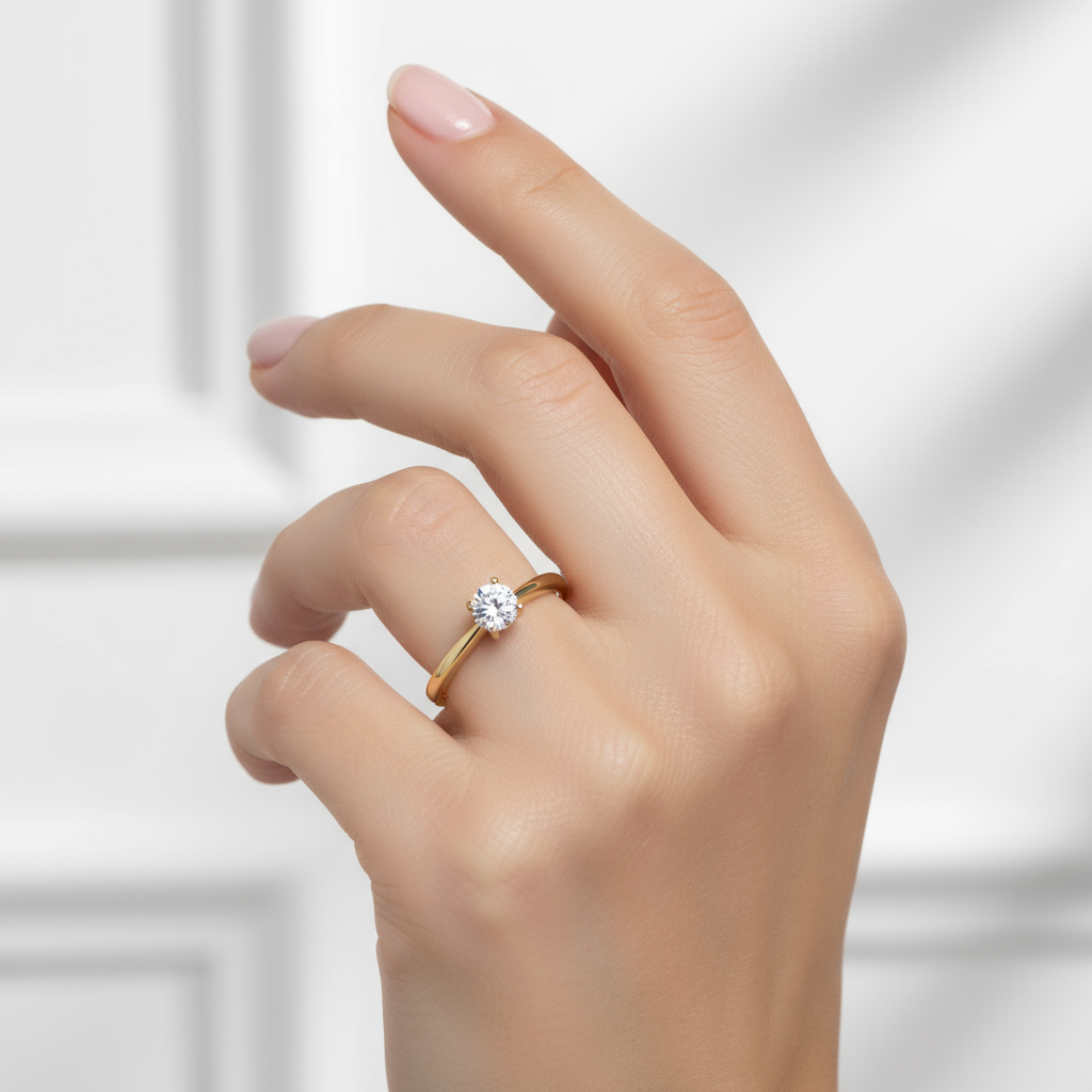 O Anel Eternita é confeccionado em ouro amarelo 18K, apresentando um design clássico e minimalista. É uma peça durável e sofisticada, ideal para ocasiões marcantes. O destaque da peça é sua pedra central redonda — uma zircônia de alto brilho — fixada em uma elegante cravação com quatro garras, proporcionando firmeza e um excelente ângulo de exposição da gema.