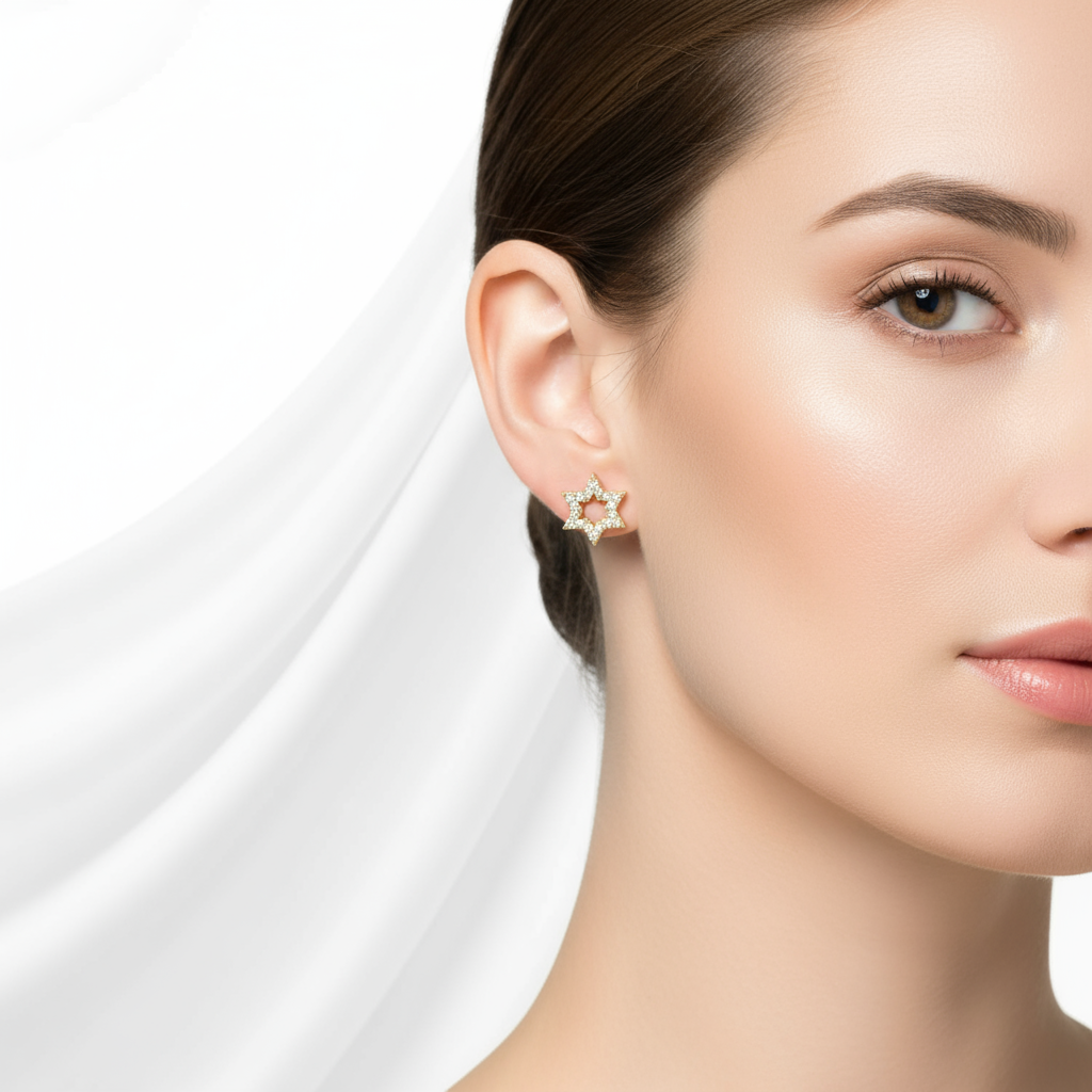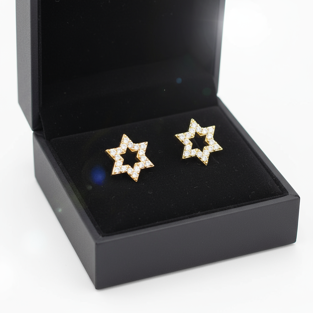 A estrutura aberta e simétrica valoriza a leveza da peça, enquanto a cravação pavê de pedras brancas oferece brilho intenso e uniforme, sem sobrecarregar o visual. Este par de brincos é confeccionado em ouro amarelo 18K, com design preciso da Estrela de Davi, símbolo de proteção e equilíbrio.