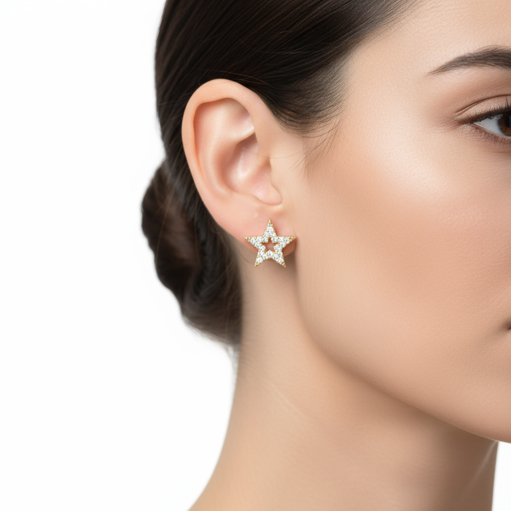 Este brinco em ouro 18K, com sua estrela cravejada de luz, foi feito para mulheres que iluminam o mundo à sua volta com autenticidade e charme. O design vazado reforça a leveza da peça, enquanto o brilho das pedras brancas captura olhares e corações. Ideal para quem acredita que detalhes revelam personalidade e que elegância está nos pequenos gestos.