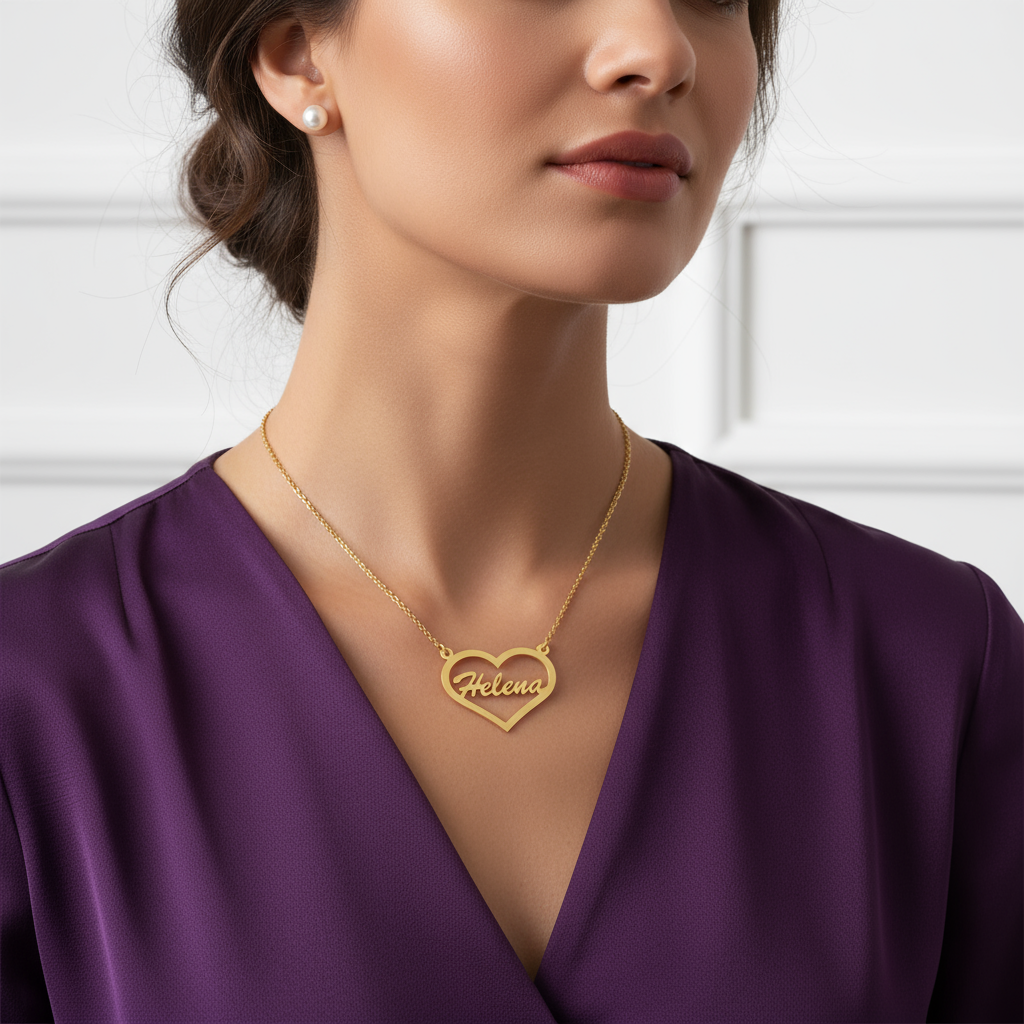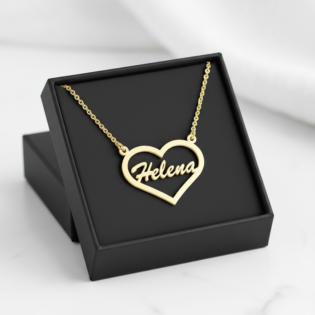 Joia confeccionada em ouro amarelo 18K (750), composta por corrente modelo veneziana e pingente com estrutura vazada em formato de coração, contendo nome personalizado centralizado em fonte cursiva. O nome é recortado a laser com precisão para manter qualidade e durabilidade.