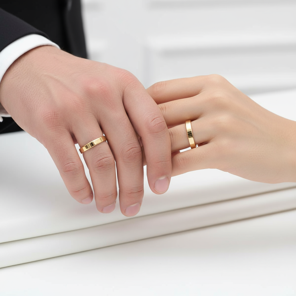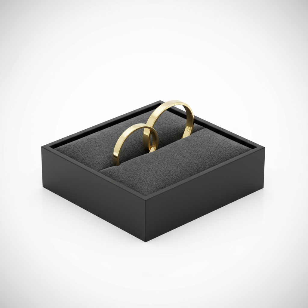 Com 2mm de largura e formato quadrado refinado, estas peças transmitem a pureza da escolha consciente, perfeita para casais que prezam por autenticidade e leveza.