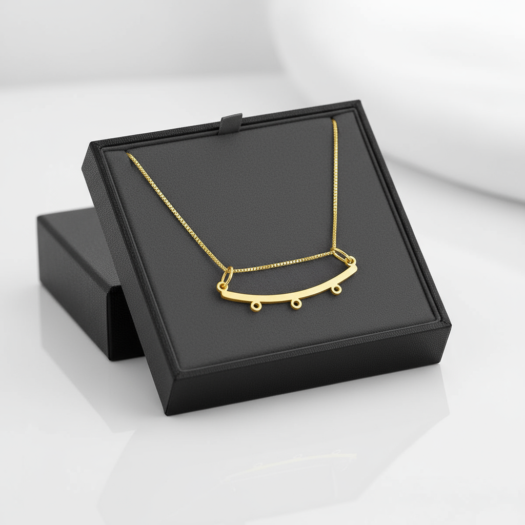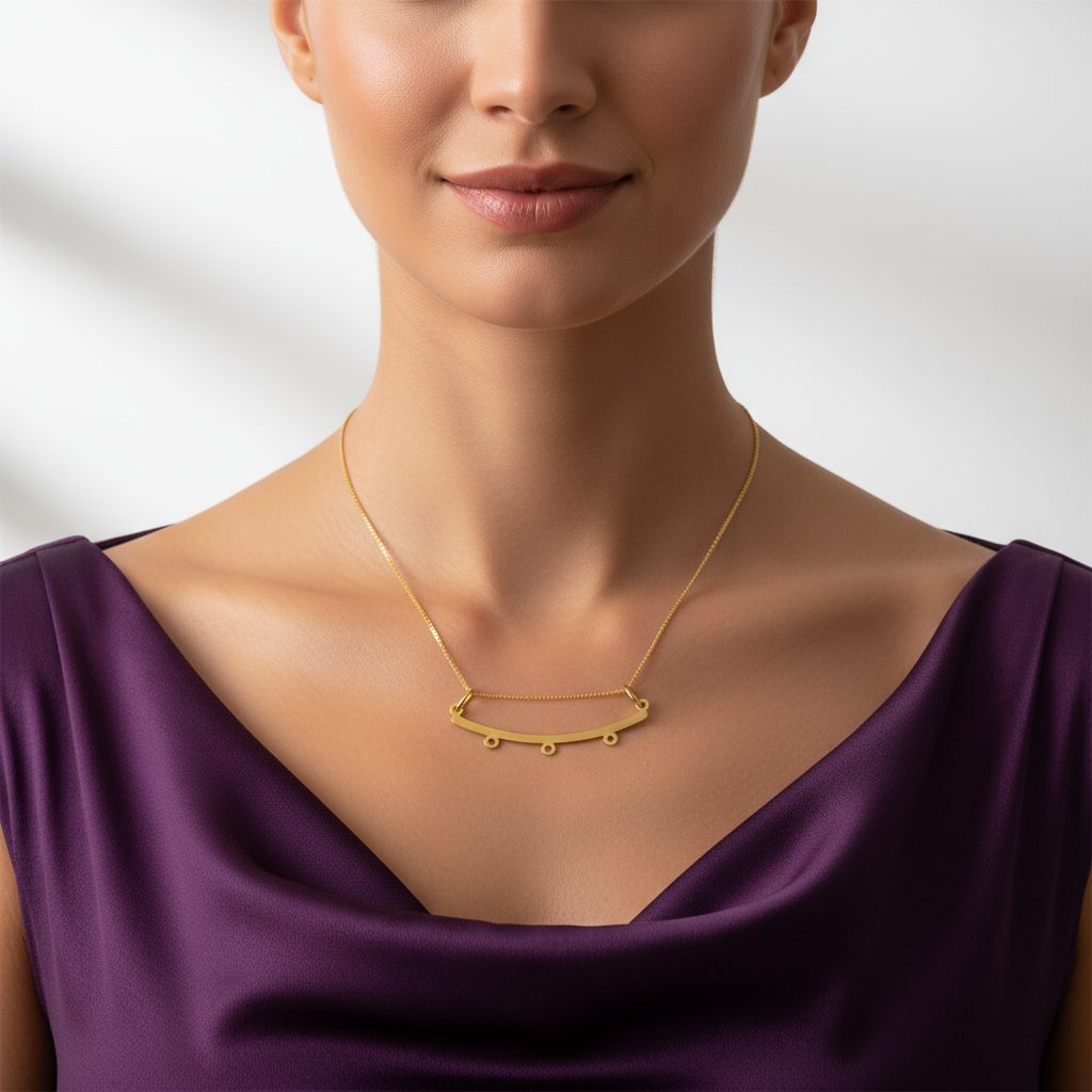 Pingente tipo canga fabricado em ouro amarelo 18K, com design curvo e acabamento polido de alto brilho. A peça possui três argolas inferiores estrategicamente posicionadas para a aplicação de pingentes personalizados, como nomes, símbolos ou pedras.