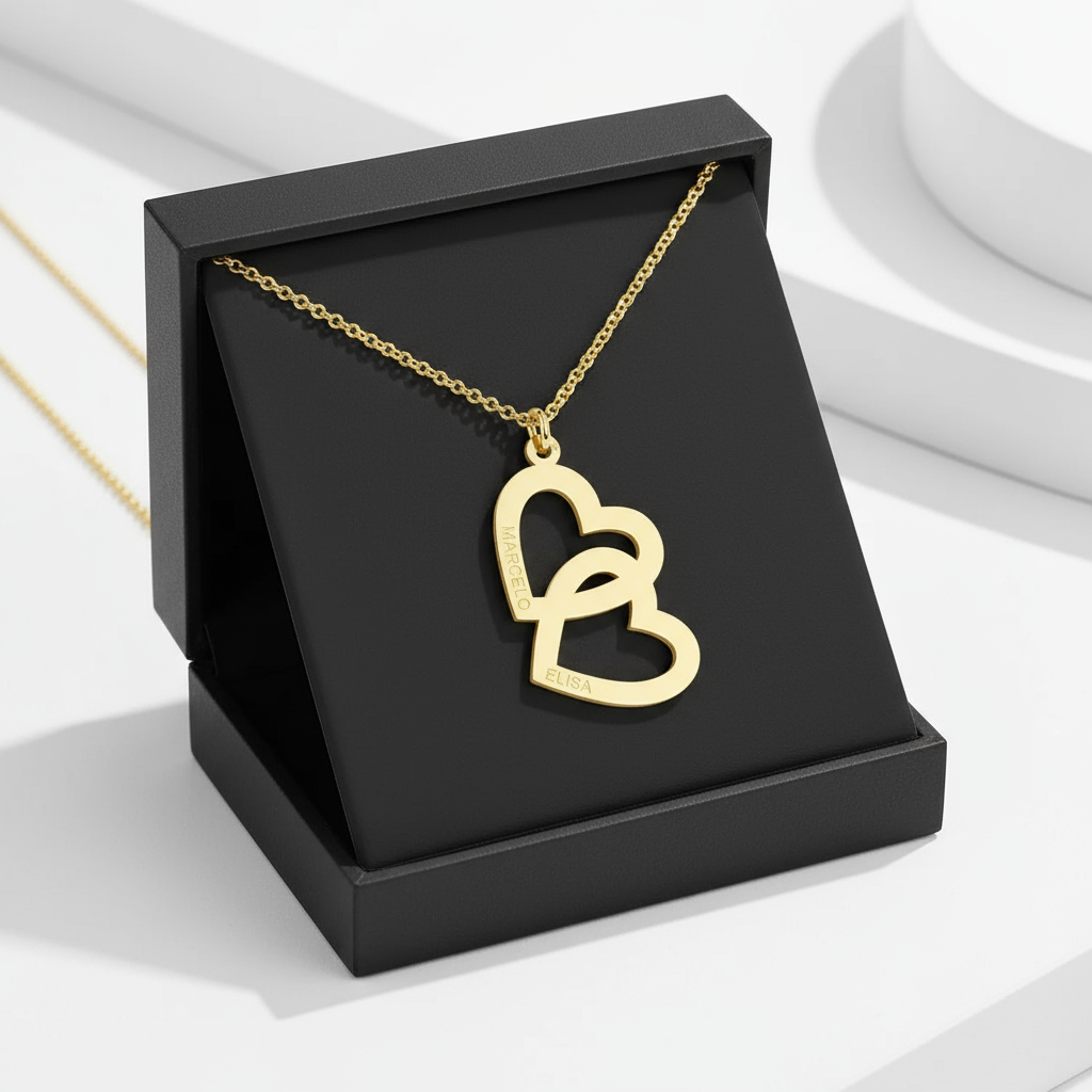 Cada curva desenha uma história de amor, cumplicidade ou vínculo eterno, eternizada no brilho do ouro e na sutileza da gravação personalizada. Este pingente de corações entrelaçados em ouro 18K é mais do que uma joia — é uma declaração. A cada olhar, você revive momentos, promessas e a força da conexão que os une.