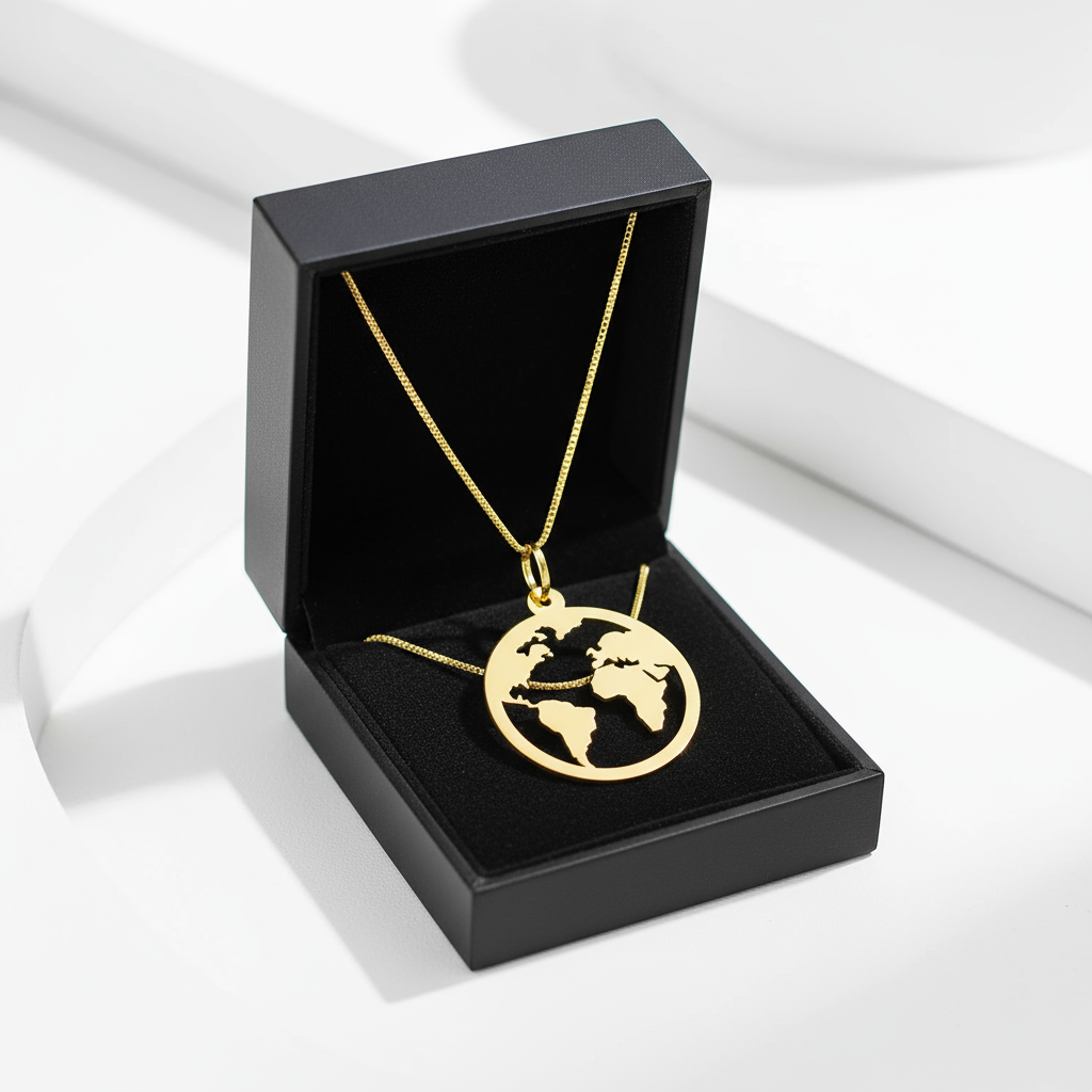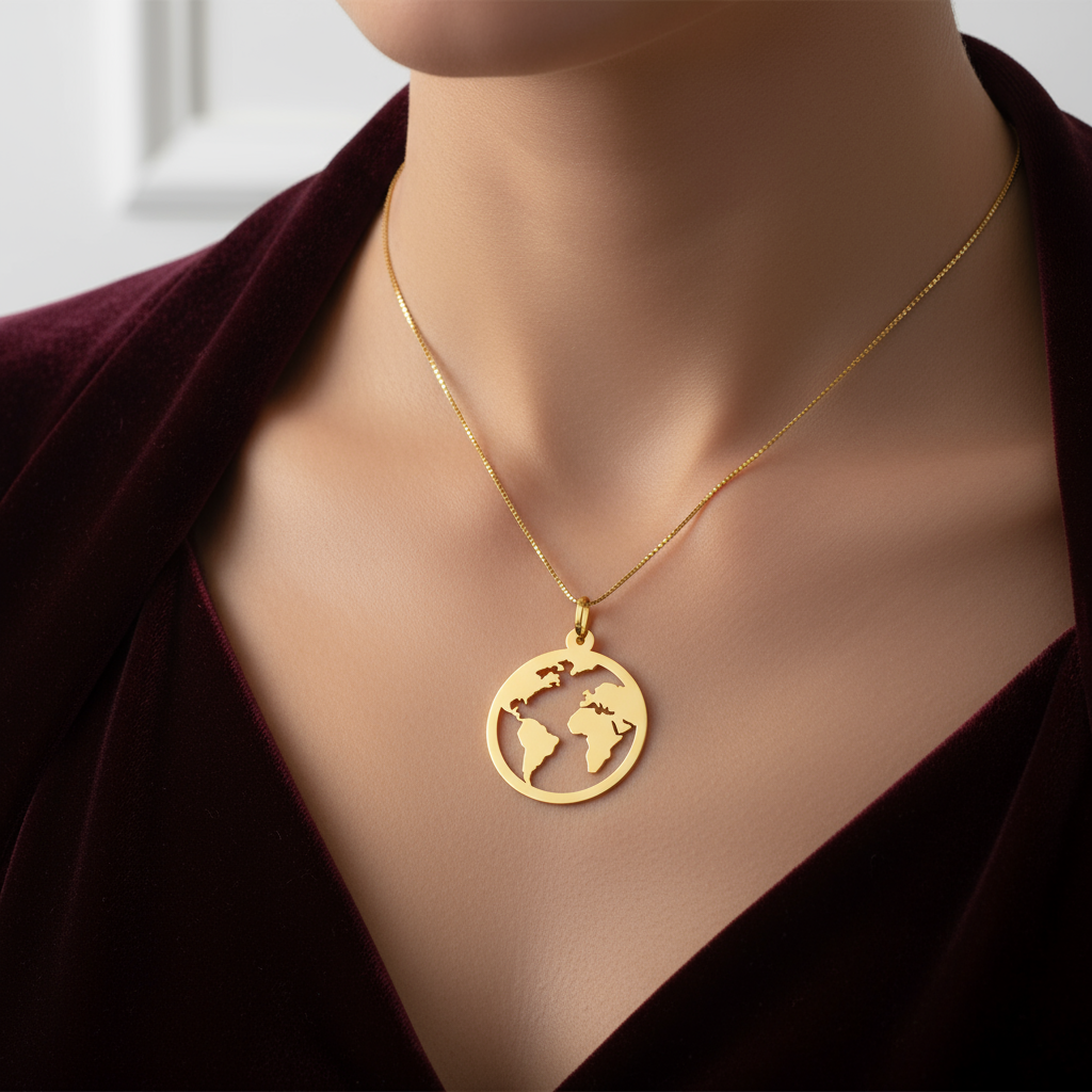 Pingente vazado em formato circular, com contorno detalhado dos continentes da América, Europa, África e parte da Ásia, confeccionado em ouro amarelo 18K. Joia maciça, leve e hipoalergênica, com garantia eterna do teor do ouro. Corrente não inclusa.