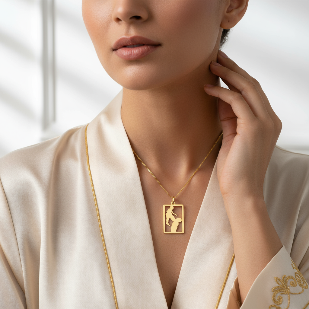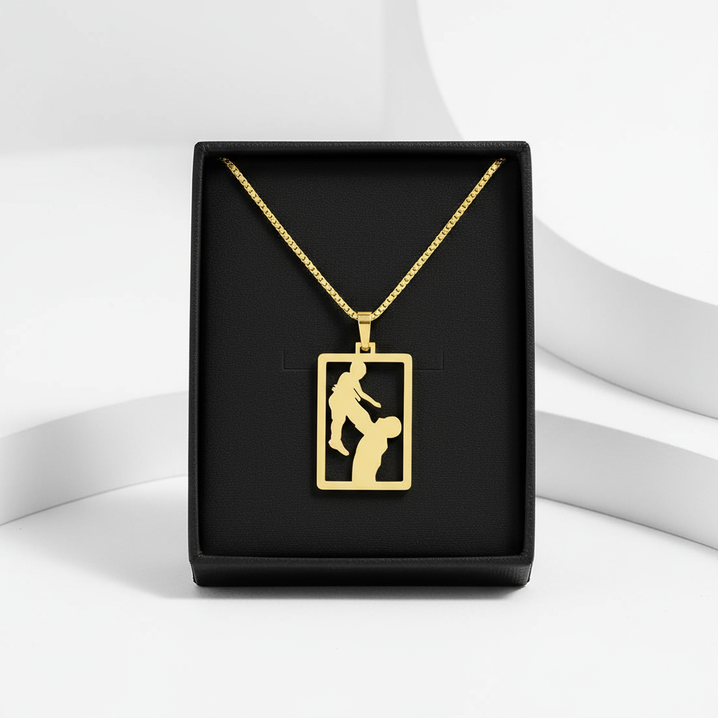 A peça combina design moderno com acabamento artesanal, refletindo sofisticação e significado. Este pingente exclusivo é confeccionado em ouro amarelo 18K, com acabamento polido de alto brilho e recorte preciso em formato de retângulo vazado, evidenciando a silhueta de um pai levantando seu filho.