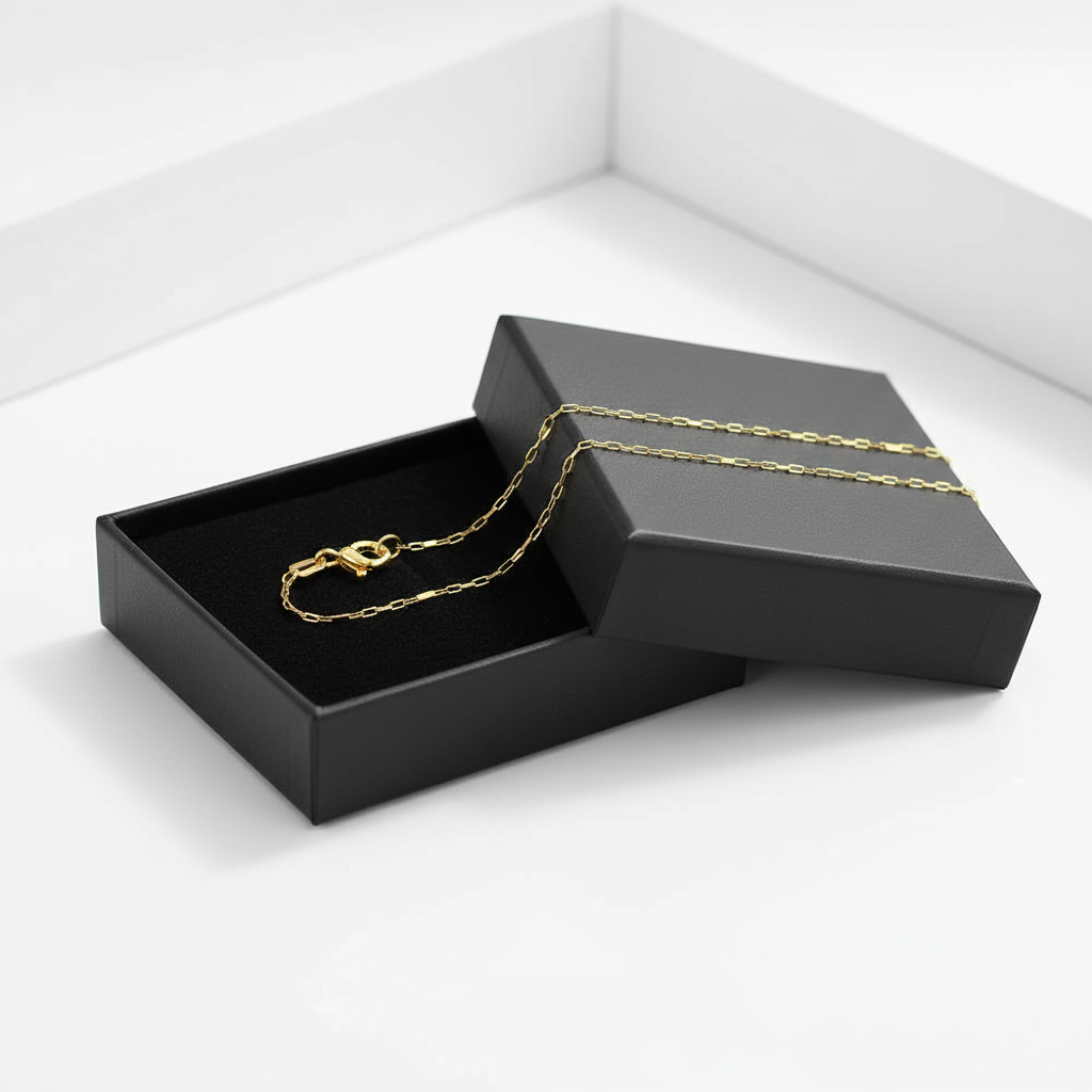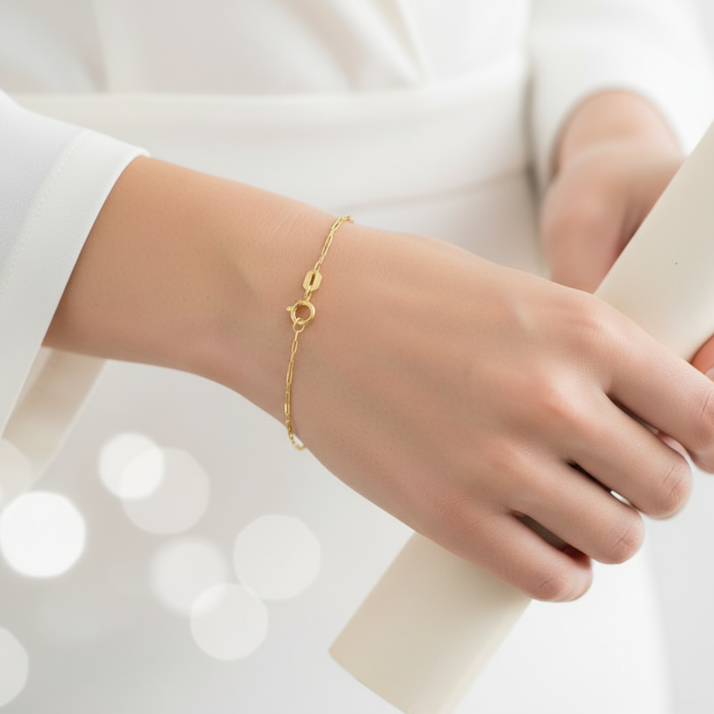 Esta pulseira apresenta elos alongados, uniformes e delicadamente polidos, oferecendo leveza e resistência. O fecho tipo argola, combinado a um elo de segurança, garante praticidade no uso e firmeza no fechamento.